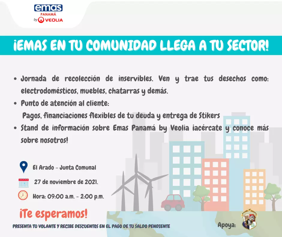 Emas Panamá by Veolia, informa a los residentes del Corregimiento El Arado en el Distrito de La Chorrera, de nuestra próxima feria, organizada con el objetivo de crear espacios de cercanía y relacionamiento con la comunidad.